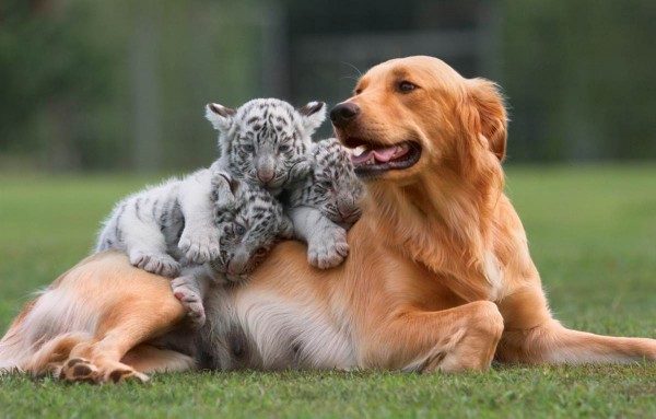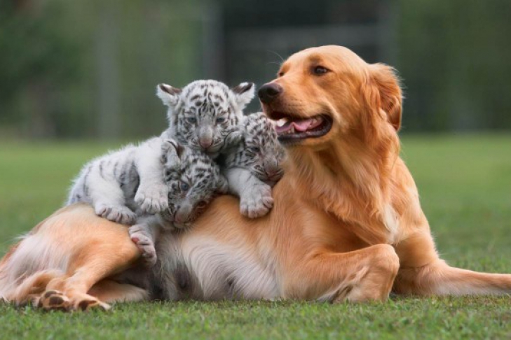 Золотистый ретривер Изабелла приняла как своих тройню бенгальских тигрят – Насику, Анику и Сидани. Зоопарк штата Канзас, США.