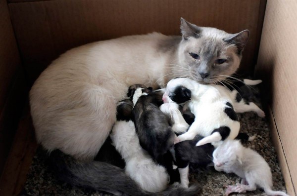 Сиамская кошка Аманда из штата Пенсильвания, США, к своим двум котятам добавила семерых щенков-сирот.