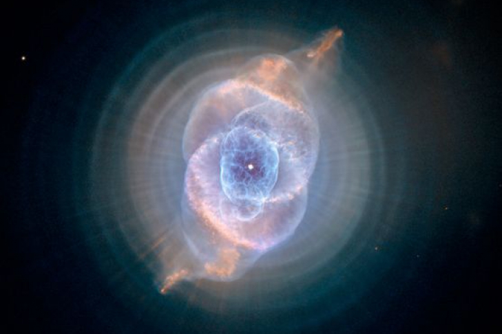 Туманность, названная Кошачьим глазом, - результат предсмертной агонии звезды, закончившей фазу красного гиганта. Ее пульсирующее ядро взорвалось, отбросив внешние слои умирающего светила за миллионы километров. Как напоминает, именно такой конец ожидает и наше Солнце.