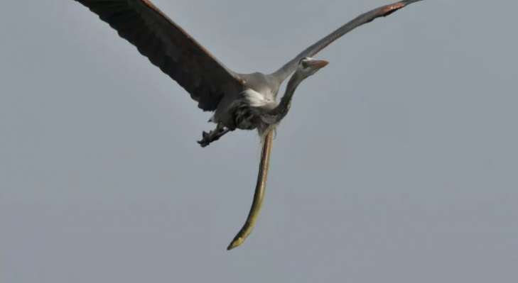 На фотографиях изображен угорь, голова которого свисает в воздухе, а цапля, ничего не подозревая, летит вперед.