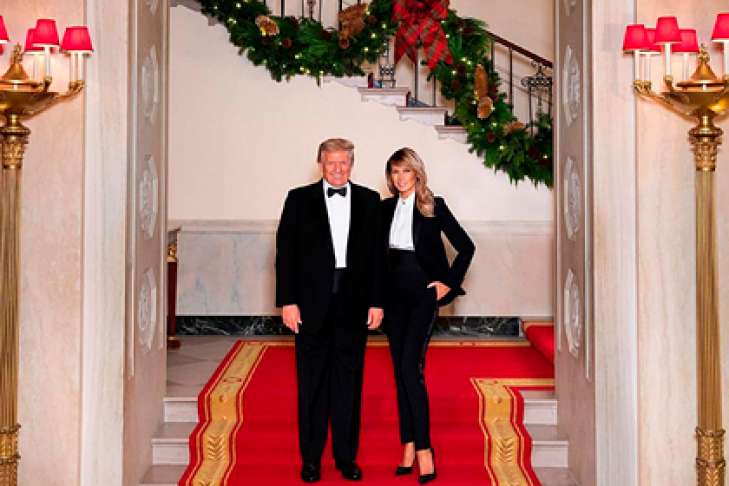 BAGNET напоминает, 20 декабря в сети появился последний рождественский снимок Дональда и Мелании Трамп в одинаковых костюмах в Белом доме. На нем пара позирует в зале на лестнице, покрытой красной ковровой дорожкой, на фоне праздничных декораций. Трамп одет в черный классический смокинг с белой рубашкой и галстуком-бабочкой, а его супруга — в аналогичный костюм и туфли-лодочки на каблуках.