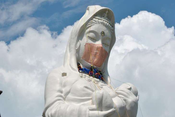В префектуре Фукусима, Япония, на 57-метровую статую буддийской богини Каннон надели маску, чтобы богиня милосердия помолилась о прекращении пандемии Covid-19. Об этом сообщает Reuters.