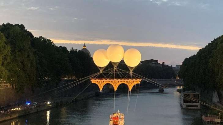 Michelangelo dreamed it, Olivier Grossetête did it: the artist from Marseille has created a cardboard bridge over the Tiber River in Rome. The 18-metre structure is suspended by three helium-filled balloons pic.twitter.com/cLAn1r5OhR