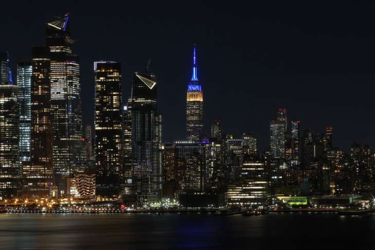 New York's Empire State Building is illuminated in the colors of the Ukrainian flag on February 25