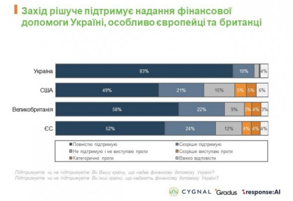 75% европейских респондентов поддерживают предоставление финансовой помощи Украине, 62% - предоставление оружия, 46% - запрет полетов и 38% - за присоединение к военному ответу.