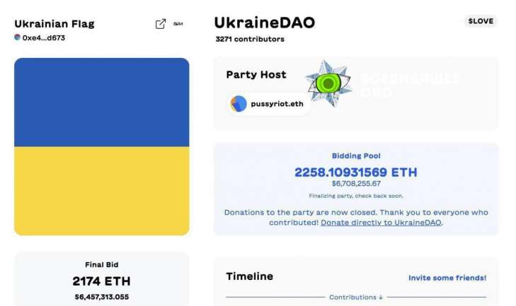 2 марта NFT украинского флага был продан пулу доноров за 2 250 ETH ($6,75 млн). Работа ушла с аукциона украинской DAO, соучредителем которой 24 февраля была участница Pussy Riot из России Надежда Толоконникова. Вырученные средства будут переданы в фонд Come Back Alive.