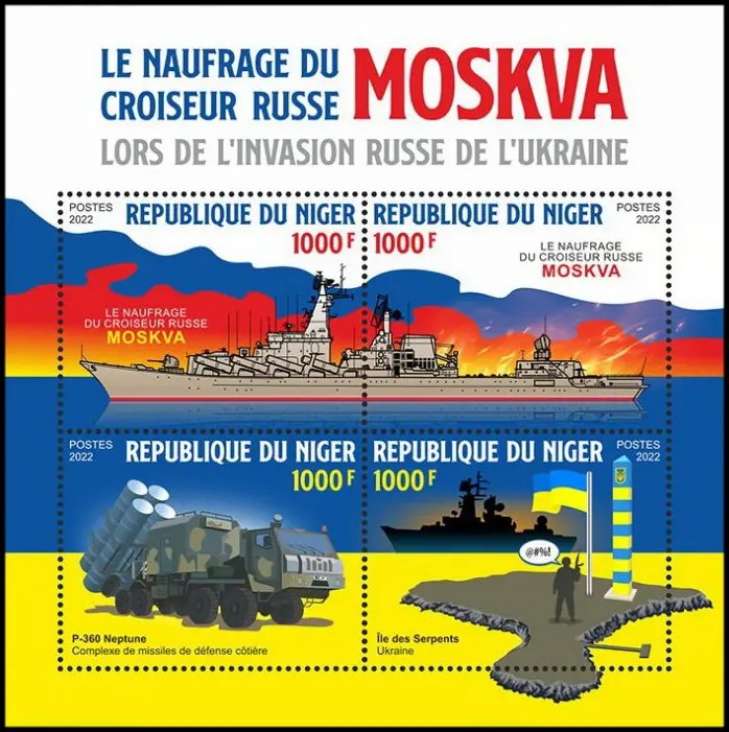 Как сообщается на сайте для коллекционеров Bomarka, вышло два блока - с одной маркой и с четырьмя - на которых изображен подбитый украинскими военными российский крейсер "Москва", остров Змеиный, ракетный комплекс "Нептун" и украинский воин, говорящий известную фразу о русском военном корабле. На сайте есть информация, что дата выпуска марок – 27 мая 2022 года.