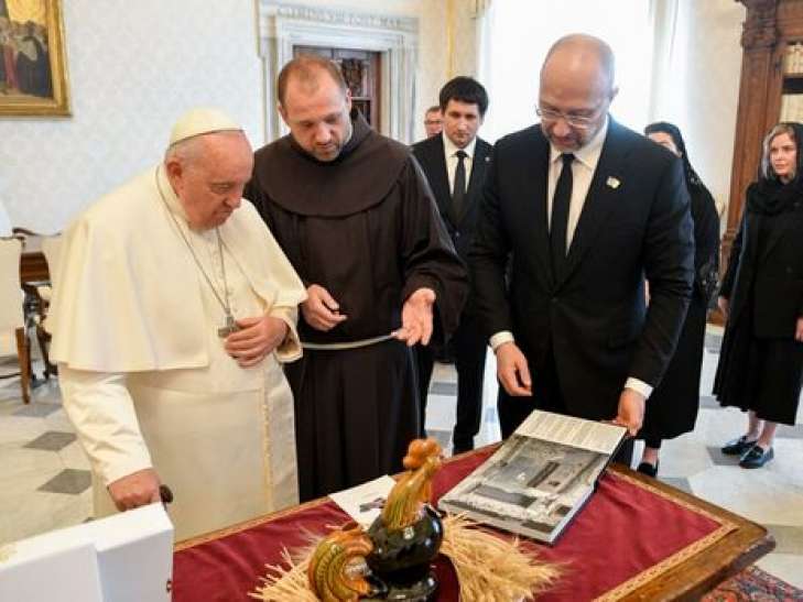 Премьер-мимнистр Украины на встрече с Папой Римским в Ватикане обсудил помощь в возвращении похищенных рашистами детей и пригласил Франциска в Украину. Он также Папе копию известного "Бородянского петушка" и фотоальбом о войне и сопротивлении украинского народа, пишет Укринформ.
