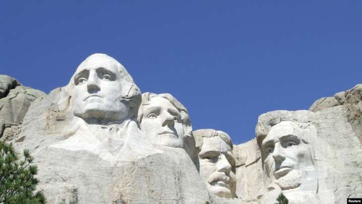 Фото: Джордж Вашингтон, Томас Джефферсон, Теодор Рузвельт и Авраам Линкольн. (Работа Гутзона Борглума). Рашмор, Блэк-Хилс, штат Южная Дакота