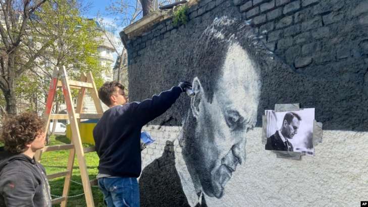 Фото: Австрийский граффити-дуэт Джоэл Гамну рисует портрет Алексея Навального на стене в Вене, Австрия, 27 марта 2024 года.