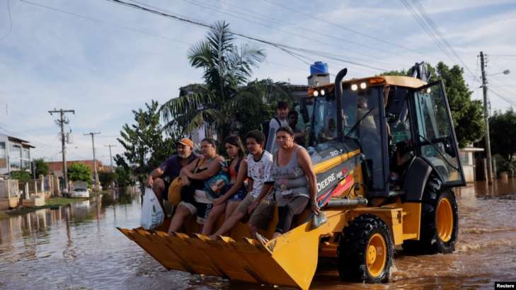 Фото: Эвакуированные едут на погрузчике после того, как их дома были затоплены в Эльдорадо-ду-Сул, штат Риу-Гранди-ду-Сул, Бразилия, 7 мая 2024 года