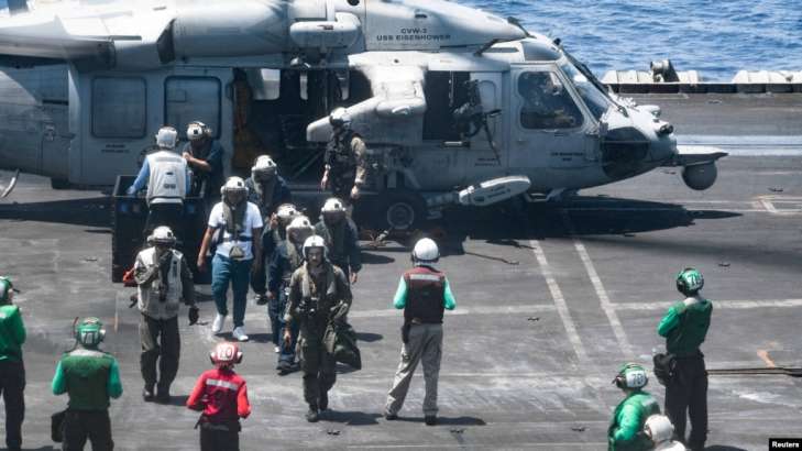 Фото: Моряки оказывают помощь терпящим бедствие морякам, спасенным с сухогруза Tutor, в Красном море 15 июня 2024 года.