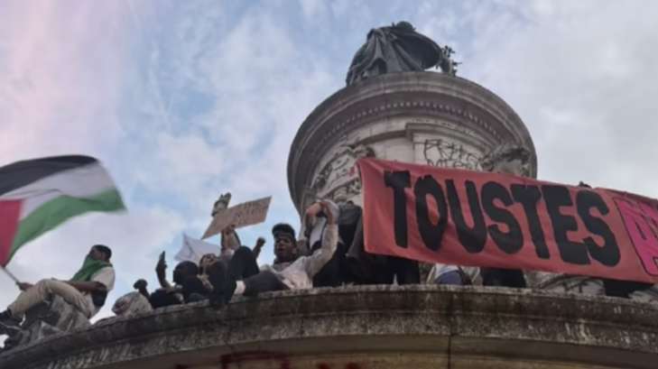 Деякі протестувальники піднялися на монумент у центрі площі, де розмахували прапорами Палестини та ПАР, а також плакатами "проти фашизму" і "проти вкрай правих". Декілька людей залишили на монументі графіті, використовуючи балончики з фарбою.