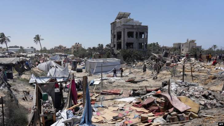 Фото: Разрушенные палатки и временные жилые постройки после израильского удара по лагерю недалеко от города Хан-Юнис, 13 июля 2024 года.