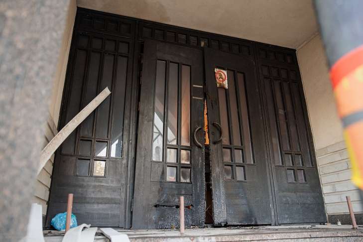 Спасателям поступило сообщение о задымлении первого этажа здания. На момент прибытия пожарных выяснилось, что со стороны двора горят деревянные входные двери здания, которые не использовались. Дверь обгорела и деформировалась, а пластиковая обшивка потолка была расплавлена.