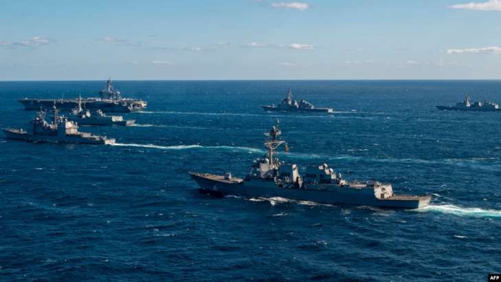 На этой фотографии, сделанной ВМС США и опубликованной 18 января 2024 года Объединенным штабом Министерства обороны Японии, запечатлен корабль ВМС США USS Kidd, следующий за кораблем USS Carl Vinson во время морских учений с ВМС Японии и Южной Кореи.