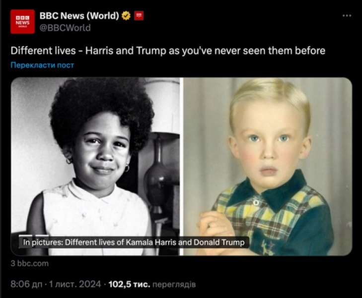 У статті "Різні життя - Гарріс і Трамп, якими ви їх ніколи раніше не бачили" BBC показала фотографії політиків у віці трьох років.