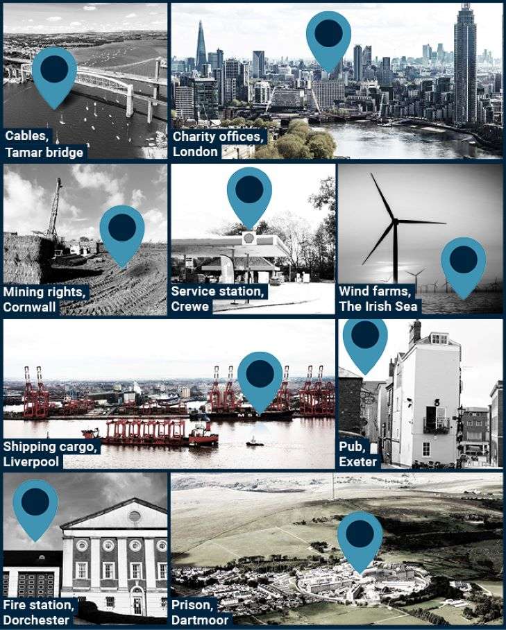 Она получает доход от платных дорог, паромов, канализационных труб, церквей, сельских ратуш, пабов, ликероводочных заводов, газопроводов, лодочных причалов, открытых и подземных шахт, автостоянок, сдаваемых в аренду домов и ветряных турбин.