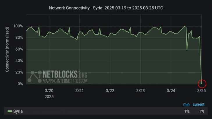 Сервіс NetBlocks зафіксував збій у роботі інтернету на всій території Сирії. У повідомленні сервісу, опублікованому 25 березня о 02:49 за київським часом, йдеться, що спочатку надійшли повідомлення про збої в роботі телекомунікаційних систем у кількох містах країни.