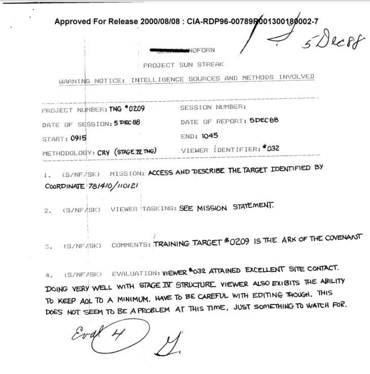 ЦРУ залучає екстрасенсів та магів для пошуку стародавніх артефактів. Згідно з розсекреченими даними, у 1988 році такий "спеціаліст" знайшов Ковчег Заповіту або Ковчег Свідоцтва.