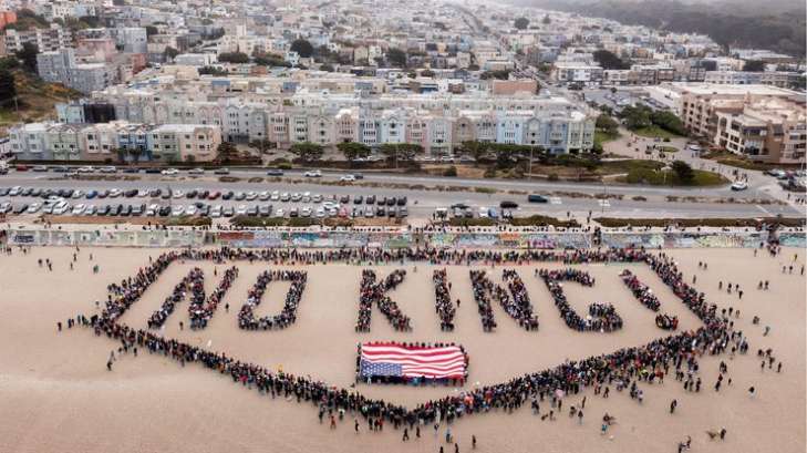 У Сан-Франциско на пляжі Оушн-біч (на фото) демонстранти вишикувалися в живий ланцюг. Так вони утворили напис "Немає короля!"