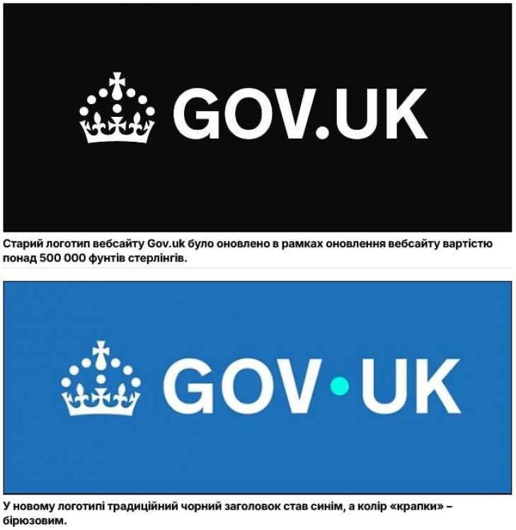 Міністерства Великої Британії виклали £532 000 з державного бюджету на новий логотип gov.uk. У межах "реновації бренду" змінено лише колір головного заголовка з чорного на синій, а також тональність крапки - вона стала бірюзовою. Усі зміни реалізовано за контрактом із рекламним агентством M&C Saatchi