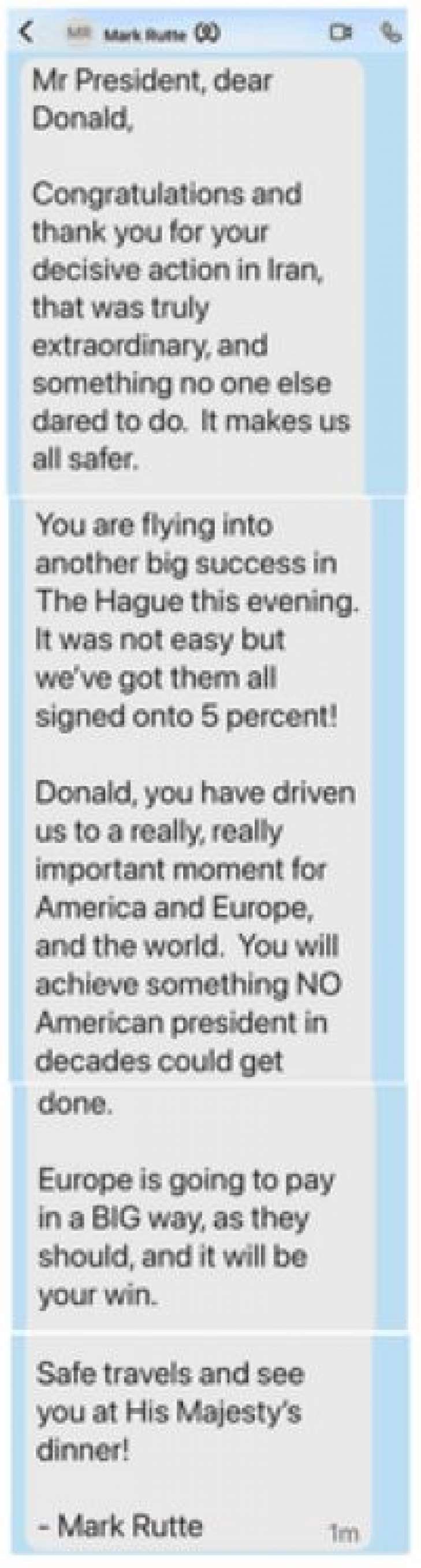 Згідно з дописом, співрозмовник на ім’я Марк Рютте подякував за "рішуче втручання США в Ірані", наголосивши, що це був крок, на який "ніхто інший не наважився". Також він анонсував "ще один великий успіх" для Трампа на саміті в Гаазі.