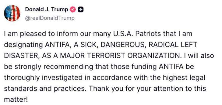 – Радий повідомити нашим численним патріотам США, що я оголошую "Антифа" - хвору, небезпечну, радикально ліву катастрофу - головною терористичною організацією.