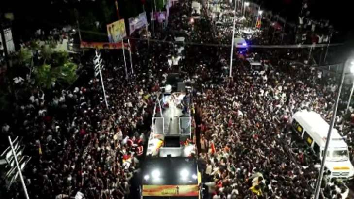 На видеозаписях, опубликованных индийскими СМИ, видно, как тысячи людей окружили предвыборный автобус, из которого Виджай выступал с речью.