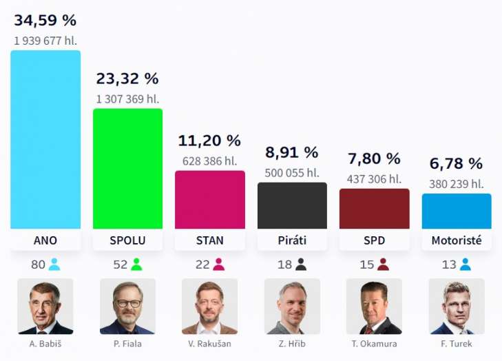 Правоцентристка коаліція SPOLU ("Разом") чинного прем'єр-міністра Петра Фіали отримала 23,25% голосів та 52 мандати.