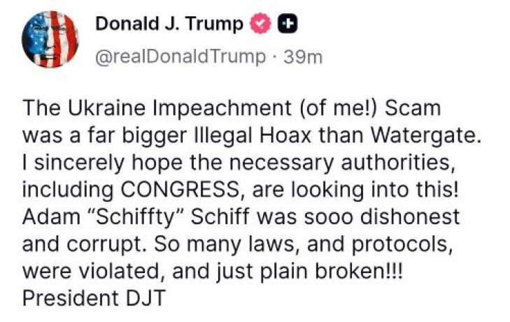 – Скандал з імпічментом в Україні (проти мене!) був набагато більшим незаконним обманом, ніж Вотергейт. Я щиро сподіваюся, що необхідні органи, включно з Конгресом, розслідують це! Адам "Schiffty" Шифф був дуже нечесним і корумпованим. Було порушено та просто зламано так багато законів і процедур!!!, – зазначив Трамп.