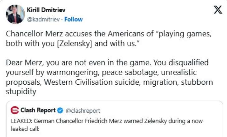 Посланець російського правителя Кирил Дмитрієв, який представляє РФ у контактах зі США щодо так званого "мирного плану", прокоментував слова канцлера ФРН Фрідріха Мерца, процитовані у транскрипті злитої розмови європейських лідерів.