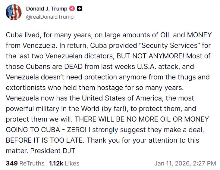Трамп наголосив, що "більшість цих кубинців мертві від нападу США", а Венесуела більше "не потребує захисту від бандитів та вимагачів, які тримали їх у заручниках роками"написав він у власній соцмережі Truth Social.