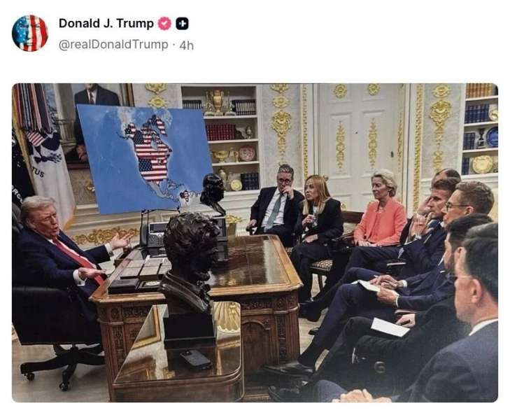 На одному з оприлюднених зображень, імовірно згенерованому за допомогою штучного інтелекту, Трамп сидить за столом в Овальному кабінеті. Навпроти нього зображені європейські лідери, а поруч встановлена карта, на якій Гренландія, Канада і Венесуела позначені як території під прапором США.