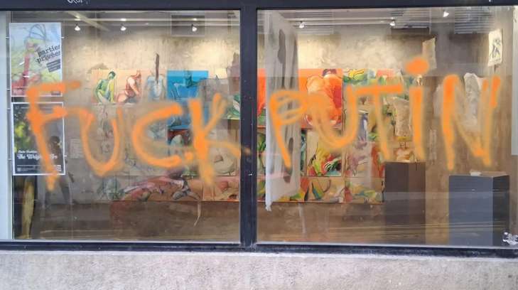 На фасаді галереї та стінах сусідніх будівель виявили кілька антипутінських графіті. Зокрема, на вітринах і навколо з’явилися написи з закликами проти очільника Кремля, а також фрази французькою та англійською мовами.