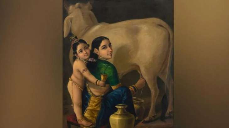 Раджа Раві Варма - засновник сучасного індійського живопису. У своїх роботах він зображував сюжети міфів індуїстів не в іконографічній манері, яка покликана викликати благоговіння у глядача, а у більш художній. До таких робіт належить і "Яшода та Крішна", написана у 1890-х роках.