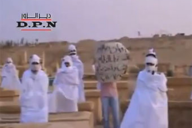 На видео показано кладбище в городе Дейр аль-Заур, посреди которого стоит завернутая в саван фигура. По ее команде из могил поднимаются недовольные Башаром Асадом «зомби». Все вместе они начинают скандировать: «Мертвые требуют смены режима!», сообщает Lenta.ru.