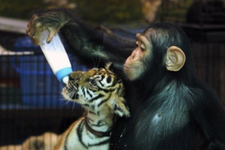 В одном из зоопарков Таиланда шимпанзе-самец Додо в занимается выкармливанием тигрят. Сотрудники зоопарка научили обезьяну держать бутылочку с молоком. После этого, он и стал «папашей» для десятка тигрят в возрасте от трех недель до четырех месяцев, сообщило ТСН.