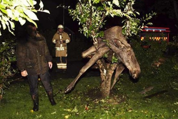 В Швеции пьяный лось застрял между ветвей дерева, на которое он взобрался. Спасать его пришлось пожарным. Они пригнули ствол к земле, и лось соскользнул на газон, сообщает 8 сентября ТСН.