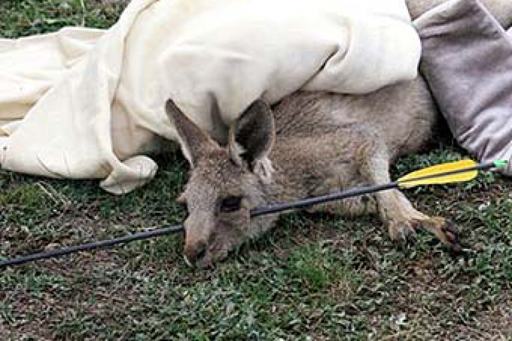 Ранее на окраине столицы штата, города Мельбурна были обнаружены два раненых кенгуру: у самца стрела застряла в голове, пробив ее насквозь, а самка получила ранение в спину. Животные были доставлены в приют, где им сделали успешные операции.