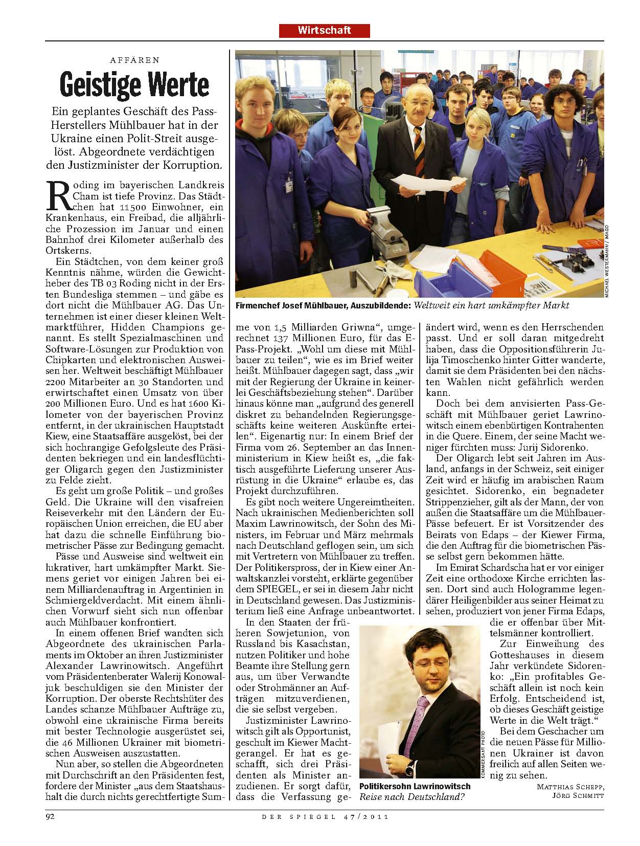 «Члены парламента в Киеве подозревают министра юстиции Александра Лавриновича в коррупции….Вместо того, чтобы заключить контракт с украинской компанией с лучшими технологиями, министру требуется 137 млн евро из государственного бюджета для проекта е-паспортов. Вероятно, эту сумму планируется разделить с «Мюльбауэр»», - значится в материале немецких журналистов.