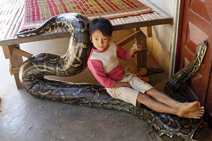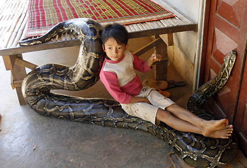 7-летний камбоджийский мальчик Уорн Самбат сидит на своей самке питона дома в Сетбо, в 20 км от Пномпеня. Этот мальчик очень привязался к 5-метровому питону весом более 100 килограмм.
