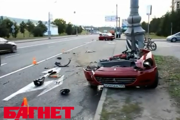Вечером 7 июля в центре Москвы, пытаясь объехать пешехода, водитель Ferrari на полном ходу врезался в столб.