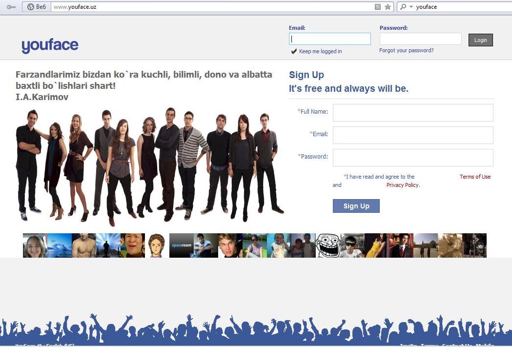 Новая социальная сеть называется YouFace. Она начала работать в Узбекистане на фоне кампании в местных СМИ против западной «массовой культуры» и «информационных атак». Не секрет, что узбекские власти крайне обеспокоены потенциально неблагоприятным воздействием иностранных вебсайтов на своих граждан, тем более что каждый третий житель страны является интернет-пользователем.