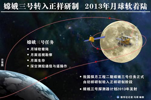 Запуск этого аппарата ознаменует начало второго этапа китайской программы по изучению естественного спутника Земли. «Чанъэ-3» выйдет на лунную орбиту, опустится на поверхность Луны и вернется обратно на Землю.
