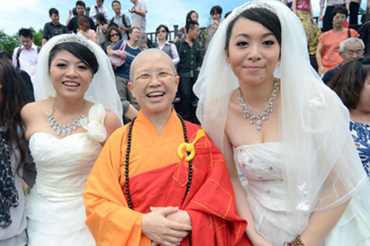 В буддийском храме города Таоюань монахиня Ши Чаохуэй соединила брачными узами 30-летнюю Фиш Хуан и ее возлюбленную Я Дин. Родители девушек хотели присутствовать на церемонии, но по каким-то причинам не смогли. Перед тем, как вступить в брак, девушки прожили вместе 7 лет.