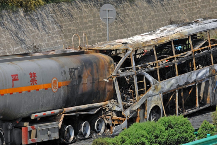 В Китае заживо сгорели 36 человек после того, как двухэтажный автобус протаранил заднюю часть автоцистерны, перевозящую метанол. Катастрофа произошла в провинции Шэньси в 2 часа ночи по местному времени на территории города Яньань на участке скоростной автострады Баотоу-Маомин, сообщило агентство Xinhua.