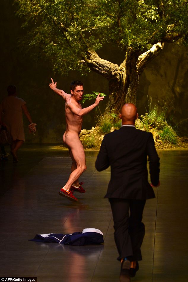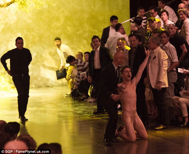 Звезды, включая нападающего «Барселоны» Лионеля Месси, могли только наблюдать, как мужчина, личность которого пока не установлена, показал все свои достоинства на подиуме во время шоу.