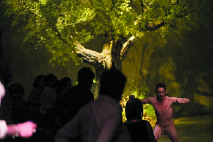 Дизайнеры демонстрировали свои творения Мужской коллекции весна/лето 2014, когда мужчина оказался в центре внимания и снял с себя всю одежду кроме пары красных кроссовок.