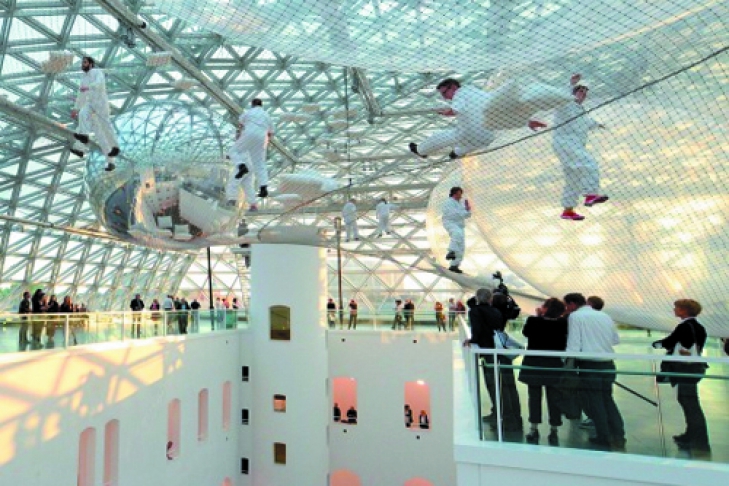 Под куполом здания на высоте более 20 метров натянули 3 уровня сетки, разделенных между собой огромными прозрачными и зеркальными воздушными шарами. Люди, балансируя на раскачивающейся сетке, могут перемещаться по необычной воздушной конструкции.